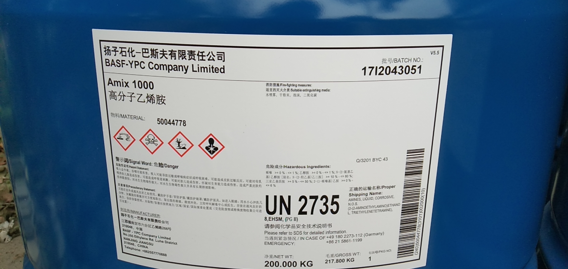 產(chǎn)品名 | 高分子乙烯胺 | 英文名 | Amix 1000 | 產(chǎn)品外觀 | 黃色粘稠液體 | 包裝規(guī)格 | 200kg/桶(鐵桶) | 產(chǎn)地 | 南京 | 供應商 | 揚子石化巴斯夫 | 應用 | 適用于各類防腐涂料、環(huán)氧行業(yè)。 | 危險類別 | 8類; | CAS NO | 68910-05-4 |